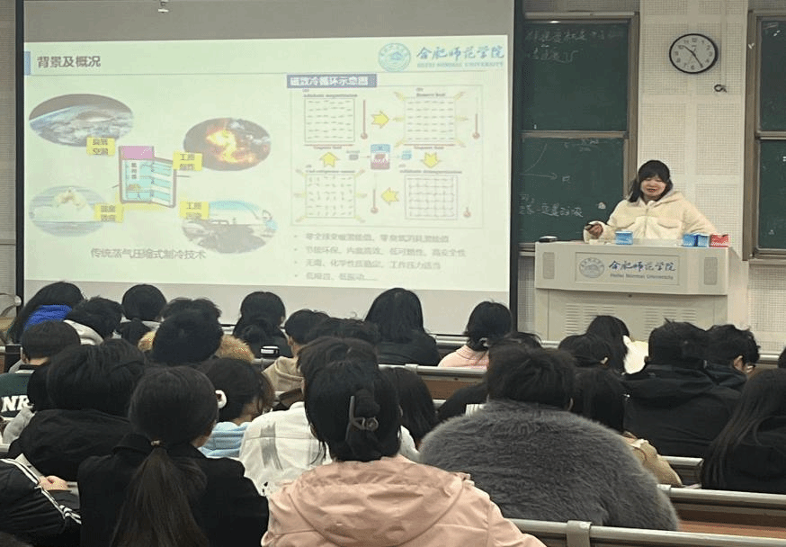 2025年3月10日上午,allwincity万象城官方网站张雪倩、胡吉玉两位老师在滨湖校区博学楼A108教室做了两场“行知讲堂”学术报告,2023级新能源材料与器件专业全体学生聆听了报告。