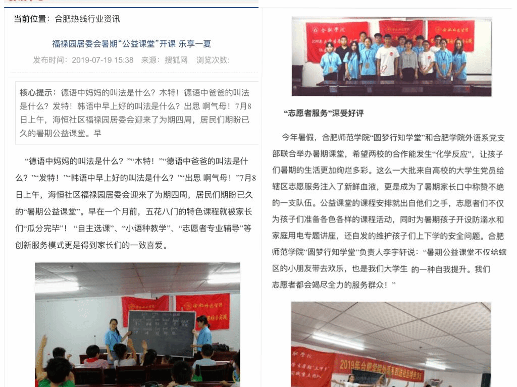 7月19日,搜狐网、合肥热线对万象城官网allwincity万象城官方网站福禄园居委会“圆梦行知学堂”进行了报道。(allwincity万象城官方网站)
