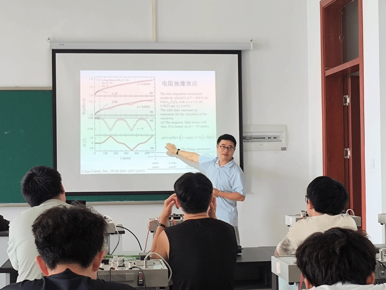 李仁文老师的报告主题为“自旋阻挫铜铁矿型CuCrO2中电阻弛豫现象研究”,报告首先以“历史上每一次新材料的发现和材料性能的提升都极有可能带来科技和经济的变革,例如超导、巨磁电阻材料”开头,引出材料研究的重要性。然后对于铜铁矿结构ABO2材料所具有的自旋阻挫特点给予解释,并指出该类材料不仅是反铁磁的磁性材料还是透明导电氧化物光电材料,是潜在的磁/电/光多功能材料,具有很好的应用价值。李仁文老师结合自己的科研经历和科研成果,在此次报告中深入浅出地对发生在多晶CuCrO2中的电阻弛豫现象进行展示和分析,并结合下学期即将开课的半导体物理与器件课程,着重对掺杂、多数载流子、载流子调控等半导体知识给予讲解,引导学生分析掺杂类型、教会学生分析其中Ti离子价态,并澄清文献中的错误,培养学生在平时学习和以后科学研究中敢于质疑的精神,报告现场气氛活跃。