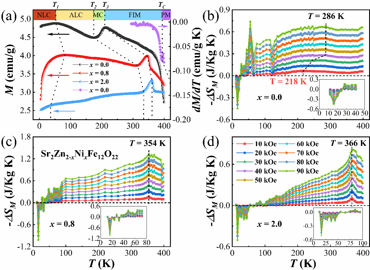 本论文发现并报道的Ni离子掺杂的Y型六角铁氧体Sr2Zn2-xNixFe12O22系列材料,在极宽的工作温区(10-400 K)同时存在符号相反的变磁场磁熵变(磁热效应)。在近室温区,随着Ni离子的掺杂浓度的增大,Sr2Zn2-xNixFe12O22的传统磁熵变(-ΔSM>0)随温度变化的曲线逐渐从“平台形”转变为“尖峰形”,“平台形”磁热效应可用于埃里克森磁制冷循环。而在低温区(T<100K),Sr2Zn2-xNixFe12O22存在突出的正值磁熵变(-ΔSM<0),此实验现象可解决磁制冷过程中的散热难题。本论文研究结果表明,Ni离子掺杂的Y型六角铁氧体Sr2Zn2-xNixFe12O22材料在宽温域、埃里克森磁制冷循环、磁制冷过程散热中均具备良好的工作性能,是一种具有极大应用前景的多功能磁制冷材料。