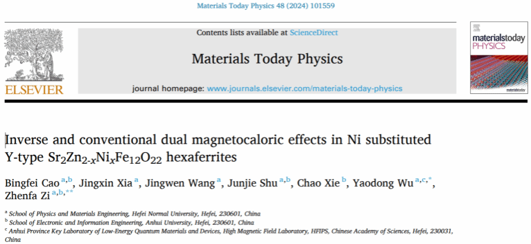 近日,allwincity万象城官方网站与安徽大学联合培养的硕士研究生曹冰菲同学与万象城官网本科生组成的学生科研团队,针对Y型六角铁氧体的磁热效应与磁制冷性能开展研究并取得重大进展,相关成果发表在《Materials Today Physics》(中科院一区,IF = 10.0),论文题目为“Inverse and conventional dual magnetocaloric effects in Ni substituted Y-type Sr2Zn2-xNixFe12O22 hexaferrites”。曹冰菲同学为本论文的第一作者,allwincity万象城官方网站新能源材料与器件专业的吴耀东、訾振发老师为本论文的共同通讯作者,allwincity万象城官方网站为唯一通讯单位。