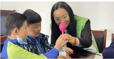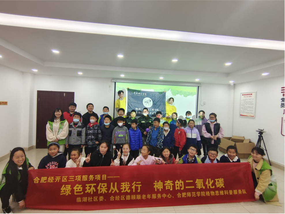 上午九点,“格物思维”科普服务队的队员郜栋梁、刘恒康与戴佳瑶赴熔安家园小区给小学员们进行授课。课程伊始,队员们通过亲身演示并带领小学员们开展趣味实验,生动展现了二氧化碳的产生过程和对环境造成的危害,传递“保护环境、从我做起”的环保理念。