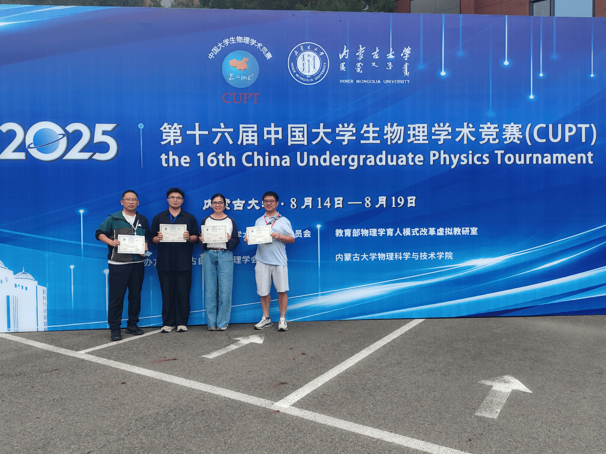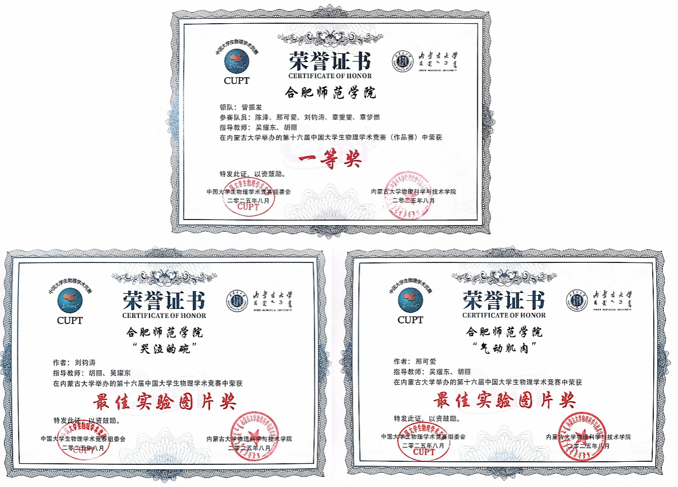 近日,由中国大学生物理学术竞赛组委会主办、内蒙古大学物理科学与技术学院承办的第十六届中国大学生物理学术竞赛(China Undergraduate Physics Tournament, CUPT)于2025年8月14日-19日在内蒙古呼和浩特市成功举办。合肥师范学院代表队此前以华东赛区作品赛道第一名的成绩,成功突围全国总决赛,并最终以全国第3名的总分斩获作品赛一等奖1项,最佳实验图片奖2项,创下万象城官网在CUPT国赛中历史最好成绩。