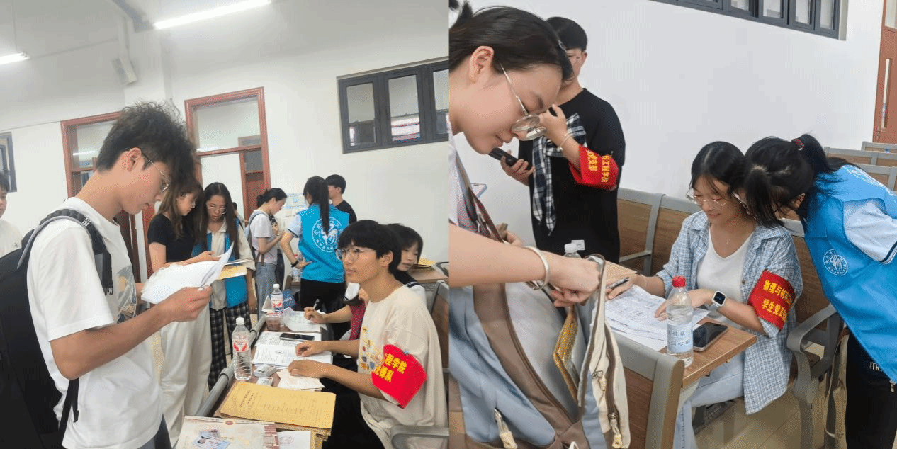 分类有序,报到处教室的新生班助耐心细致,为2025级新生核查报到材料,办理入学手续,同时宣传助学贷款、学费减免等政策,解答军训体检、开课安排等问题。