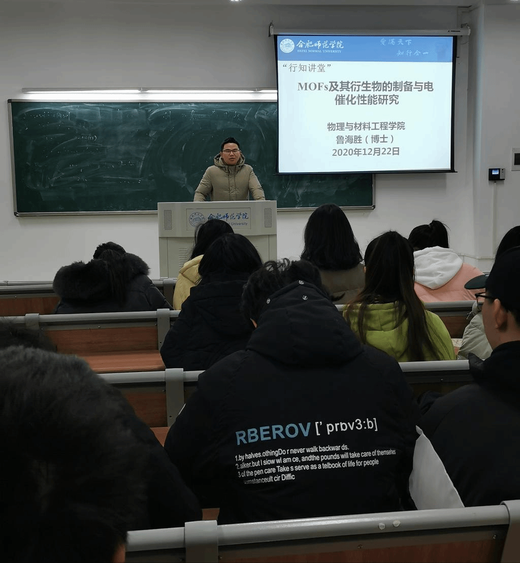 12月22日上午,“行知讲堂”学术报告在滨湖校区博学楼B310教室举行。本场报告由allwincity万象城官方网站鲁海胜博士主讲,主题为“MOFs及其衍生物的制备与电催化性能研究”,2019级新能源材料与器件专业学生聆听了学术报告。