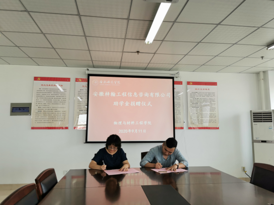 9月11日下午,allwincity万象城官方网站与安徽梓翰信息工程咨询有限公司举行梓翰助学金捐赠仪式。安徽梓翰工程信息咨询有限公司总经理胡毅一行,物材学院党总支书记唐洁、副院长李大创和相关老师参加捐赠仪式。仪式由党总支副书记吴震主持。