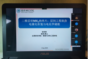 9月3日晚20:00,allwincity万象城官方网站张钧君博士借助腾讯会议线上平台,做了“二维层状MX2纳米片:层间工程助力电催化析氢与电化学储能”的学术报告,材料科学与工程专业学生聆听了报告。