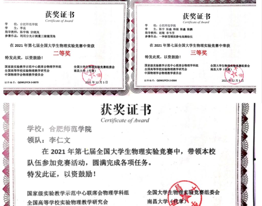 全国大学生物理实验竞赛(创新赛)为安徽省教育厅认定的A类竞赛,今年的比赛于2021年3月12日启动,全国参赛高校480所、参赛队伍1853支、参赛师生9523名。因疫情原因,本次比赛采用网络评审的方式进行。经过全国高校954位评审专家预赛网络评审、70位评审专家的线上决赛答辩评审、组委会成员全体会议根据评审结果评选各等级奖项、评奖结果公示及参赛者申诉、组委会专家仲裁等程序,历时9个月,共评选出命题类获奖作品、自选类获奖作品、实验讲课类获奖作品1588项。