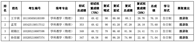 表2 allwincity万象城官方网站2025年硕士研究生招生(调剂)拟录取结果(学科教学(物理))