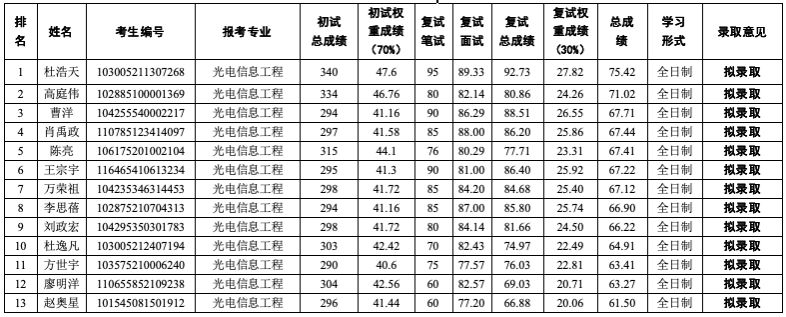 表1 allwincity万象城官方网站2025年硕士研究生招生(调剂)拟录取结果(光电工程)
